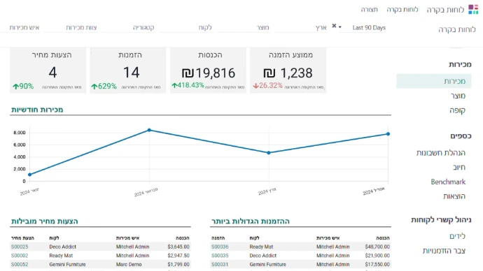 ניהול מכירות ממוקד לקוח, רב-ערוצי ודיגיטאלי, ניתן לנהל את קשרי הלקוחות בעזרת Odoo ב-360 מעלות, ולמכור בכל הערוצים- ממסחר אלקטרוני, מוקד מכירות, סוכני מכירות ניידים, שרות עצמי וקופה בחנות או מסעדה, לחייב מנויים קבועים, להשכיר ציוד או לבצע תיקונים עם חיבור מובנה למודולים הלוגיסטיים והפיננסיים.
