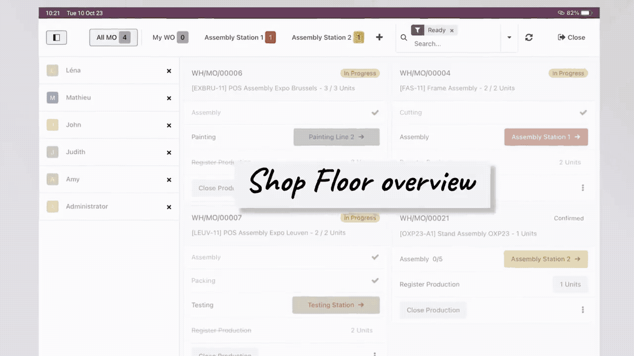 ניהול רצפת הייצור (MES) מאפשרת לנהל הוראות ייצור ועבודה לפי עצי מוצר וכרטיסי ניתוב, לתזמן משימות לעובדים, ולשלב בקרת איכות, תחזוקה מונעת וניהול חיי מוצר. העובד מדווח בזמן אמת דרך מסך נייד שמציג גם שרטוטי הדרכה, ומערכת הבקרה מספקת התראות על איכות בכל תחנה.